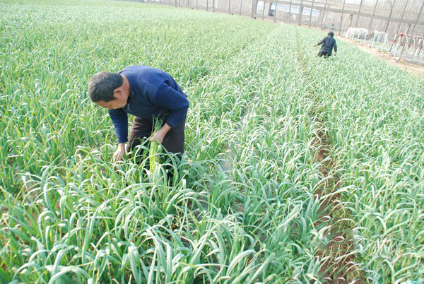 4月9日,平邑县农民在收货早春蒜苔,地头收购价高达6元一市斤。
