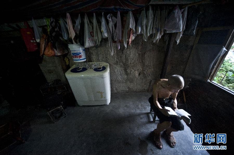 85岁的陈定然老人在旅舍内看书,老人在巫山县城无依无靠,靠乞讨为生,已在此居住3年(8月8日摄)。