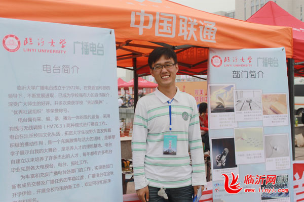 校电台李津楠,法学院大二学生,对临沂大学有很深厚的感情。身穿白底绿横条T恤的他,活泼健谈,脸上洋溢着自信。