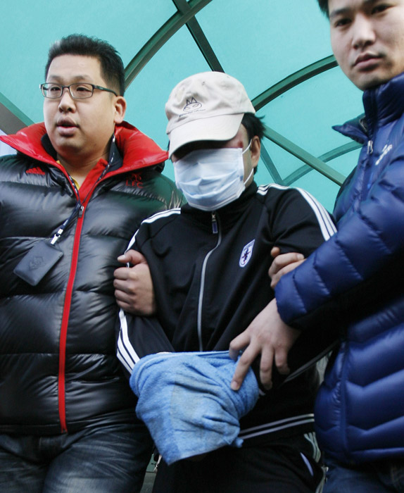据韩国仁川海洋警察署表示,仁川海警警长李某(41岁)等两名特攻队员当天上午7时在仁川市瓮津郡小青岛西南方85公里海上抓捕非法捕捞的中国渔船时被中国船员挥舞的玻璃碎片刺中。图为肇事中国渔船船长被押往警局。