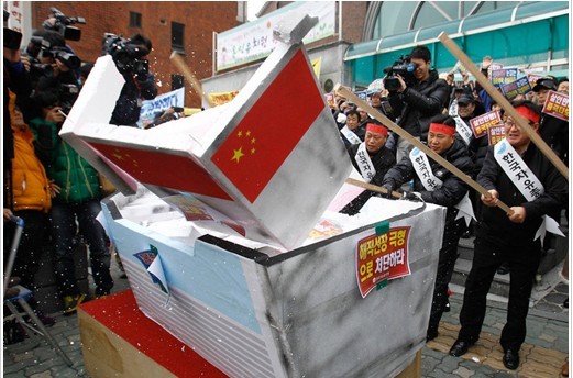 据12月15日出版的《环球时报》报道,韩国的示威者14日又在中国使馆外示威,并喊出“如果中国渔民再暴力对抗就把中国使馆变成焦土,并发起抵制中国货运动”这类极端而偏激的口号。多家国际媒体过去两天集中报道了这些来自首尔的火爆场面,他们中大多数在标题中突出“韩国人的愤怒”。