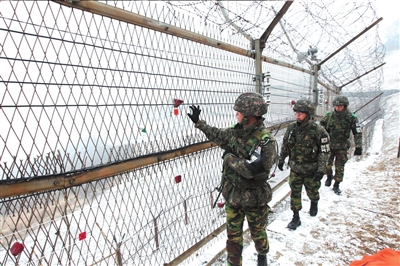 21日,韩国士兵在朝韩边境上巡逻。图/人民图片