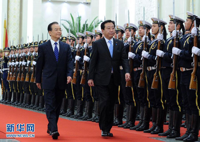 这是会谈前,温家宝为野田佳彦访华举行欢迎仪式。