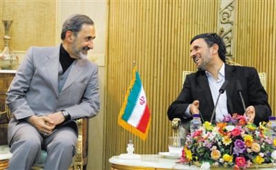 14日,伊朗总统内贾德访问拉美回国以后,同一名官员交谈。