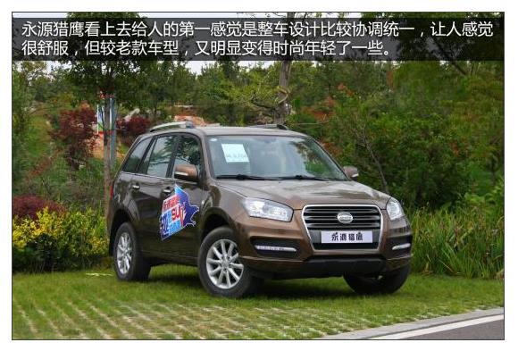 外观:永源猎鹰的外观进行了大幅升级,比较流行了大尺寸中网和LED日间行车灯等设计都被加入其中。整车造型比较协调,虽不能过目不忘,但整体感觉比较耐看,较老款车型更加大气时尚。