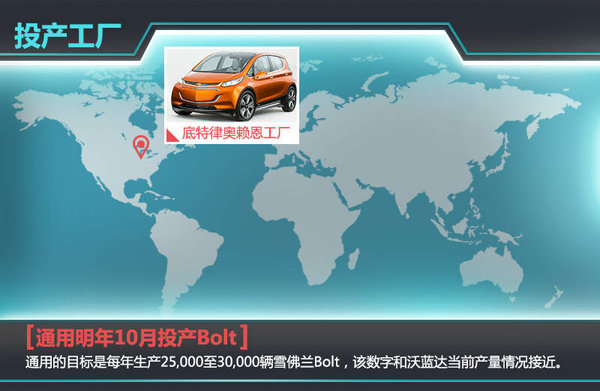 按照规划,通用汽车预计将于2016年10月起投产雪佛兰Bolt纯电动车,地点是底特律北部的奥赖恩(Orion Township)小型车(紧凑车)工厂。通用的目标是每年生产大约25,000至30,000辆雪佛兰Bolt。该数字和雪佛兰沃蓝达插电式混合动力车当前接近,例如2012年沃蓝达全球销量为30,090辆。雪佛兰Bolt的预计售价区间在30,000至35,000美元(约合人民币18.7万-21.8万元)之间,有望在扣除联邦退税优惠后降至30,000美元以下,预计上市时间为2017年。