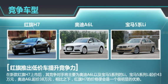作为豪华行政级桥车,在目前的中国市场上都绕不过奥迪A6L这个霸主。作为国内多年中大型轿车销量的冠军,2014年奥迪A6L的销量为16.4万辆。其入门级车型搭载一款2.0T涡轮增压发动机,最大功率为132kw,匹配6速手动变速器。红旗H7的上市将成为其直接的竞争对手,值得一提的是红旗H7 1.8T车型的售价预计为25万元起,这将比奥迪A6L入门级车型38万起步的价格低了不少。届时,红旗H7将在售价方面拥有更多优势。