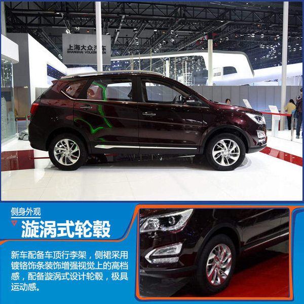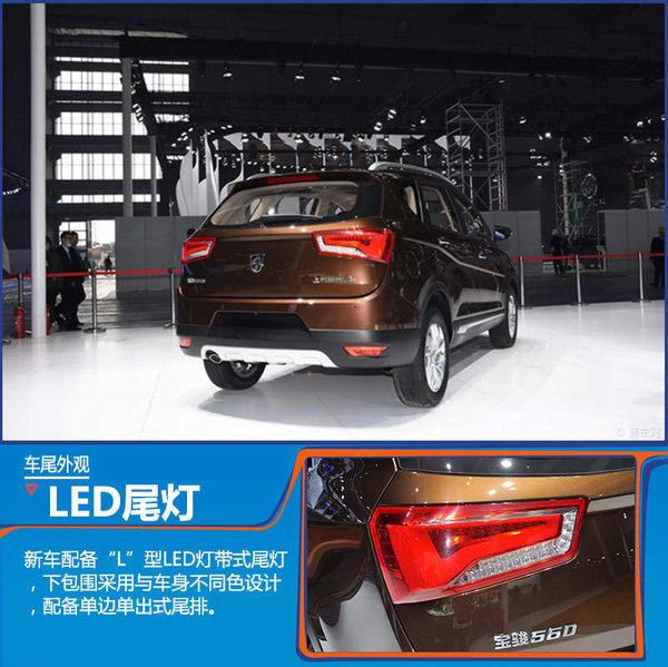 宝骏560车身设计高挑,侧面线条较为简洁匀称并配备有车顶行李架,侧裙采用镀铬饰条装饰增强视觉上的高档感。新车配备漩涡式设计轮毂,极具运动感。宝骏560的尾部设计较为饱满,尾灯造型风格与车头灯相呼应并融入LED光源。新车配备单边单出尾排搭配银色护板装饰,再次为整车增添运动元素。