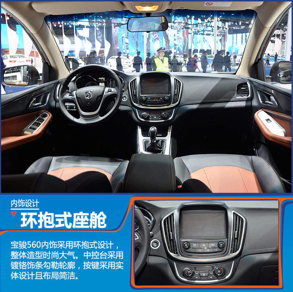 宝骏560内饰采用环抱式设计,整体造型时尚大气。中控台采用层次化设计,采用镀铬饰条勾勒轮廓,按键采用实体设计且布局简洁合理,搭配大尺寸中央液晶显示屏提供不错的人机交互体验。新车配备三幅式多功能方向盘,功能按键采用常规布局。后排空间优化较为合理,可提供不错的腿部空间。此外该车还拥有蓝牙电话、一键式启动、外后视镜电动调节按键、后排出风口等配置。