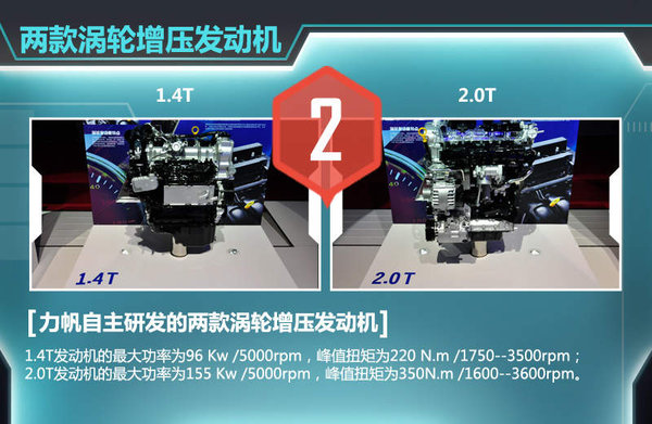 力帆作为深化和贯彻工信部这一节能减排理念的先驱,自主研发涡轮增压技术发动机。其自主研发的1.4GDI涡轮增压发动机通过自身轻量化的技术特点,不但具备了典型涡轮增压发动机的高功率、高扭力的技术特点,同时还进一步降低油耗,减少噪音。与1.4GDI同时研发的2.0T涡轮增压发动机同样能提供高功率、高扭力的动力输出,而且与同排量的传统发动机相比,燃油消耗要降低10%左右,排放高于国5标准。