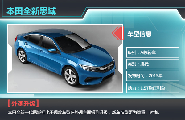 本田全新一代思域有望于年内发布,新车在外观以及动力方面得到大幅升级,在外观方面新车给人的感觉更为稳重、时尚,本田家族性的前脸在全新思域上得以延续,宽大的镀铬横条霸气十足,新车大灯组经过重新设计,造型时尚、犀利,更符合现代人的审美观念;动力方面本田全新思域将搭载1.5T涡轮增压发动机,在排量降低的同时还可以收获强劲的动力输出,可谓是一举两得。