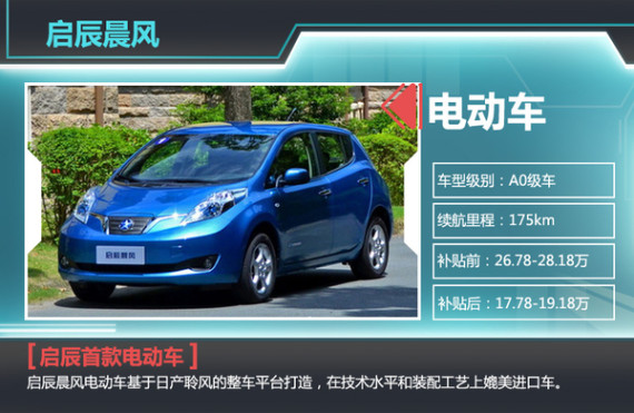 启辰晨风是2014年的推出热门电动车之一,同时也是启辰品牌推出的首款电动车。据了解,启辰晨风基于日产成熟的聆风电动车技术平台打造,应用锰酸锂离子电池,总容量达到24千瓦时。晨风搭载永磁同步电动机可以实现80kW的最大功率,高达254Nm的峰值扭矩,最高时速达到144km/h,0-50km/h加速时间为4.4秒。在消费者最为关注的续航里程方面,晨风可实现综合工况下行驶175公里。