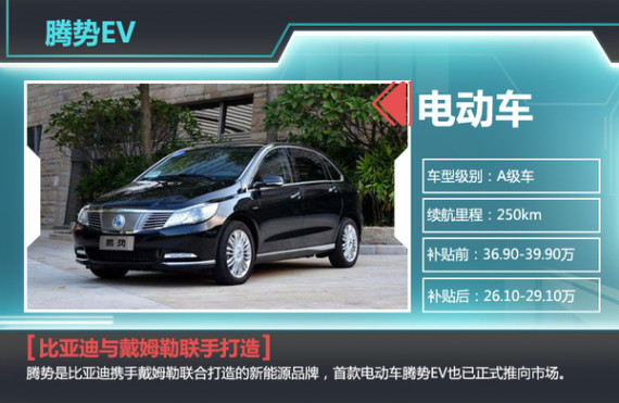 在技术平台方面,腾势EV电动车整合了比亚迪和戴姆勒双方的技术,并基于成熟的奔驰B级车平台打造全新电动车。在深圳拥有专属的腾势生产线,采用戴姆勒公司的制造标准、生产工艺以及供应商体系,以保证腾势汽车的产品质量。腾势EV采用磷酸锂铁电池组,总容量为47.5千瓦时,搭载的永磁同步电动机最大功率达86kW,峰值扭矩为290Nm,最高时速为可达150km/h。在综合工况下续航里程方面,腾势EV电动可实现行驶250公里,等速80公里可实现300公里的续航里程。