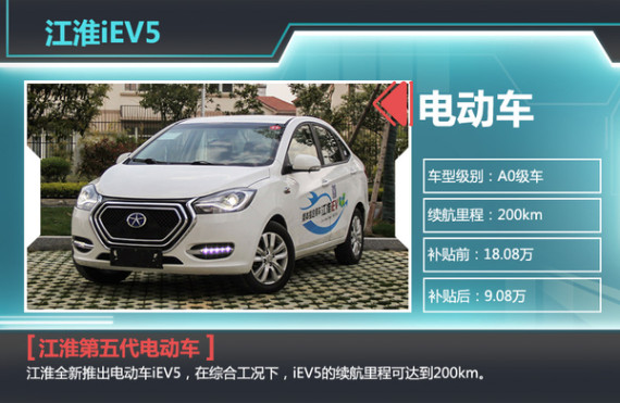 江淮全新推出电动车iEV5,相比iEV4的续航里程和动力性能得到了极大提升,应用总容量为23千瓦时的三元锂电池组。在综合工况下,iEV5的续航里程可达到200km。该车搭载的永磁同步电动车最大功率为50kW,电机峰值扭矩达到215N.m,最高时速可达120km/h。此外,iEV5提供6种充电模式,其中家庭慢充模式下充满电需要7小时,专用快速充电设备充满电仅需2.5小时。