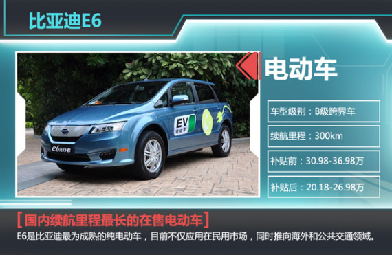 E6是比亚迪自主研发并推向市场的首款电动车,定位为一款偏向五人座跨界车,采用自主研发生产磷酸铁锂电池作为动力源泉,电池容量为57AH。比亚迪E6搭载永磁同步电动机可实现90kW的最大功率,高达450Nm的峰值扭矩,最高时速达到140km/h,0-50km/h加速时间为4.4秒。在综合工况下续航里程方面,比亚迪E6可实现行驶300公里。