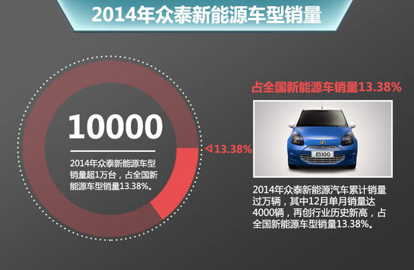 众泰作为国内较早涉足新能源领域的车企,2012年便投入2.6亿研发资金用于纯电动汽车核心技术的突破。2014年众泰新能源汽车累计销量过万辆,其中12月单月销量达4000辆,再创行业历史新高,占全国新能源车型销量13.38%。根据众泰汽车的战略规划未来5年内,企业还将推出10款全新的新能源汽车,并将众泰汽车打造为一个独立的新能源汽车品牌。