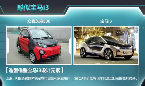 芝麻E30的消费群体锁定城市白领和家庭用户为主,为此众泰计划将该车的造型打造的更加时尚,一定程度上借鉴了宝马i3的设计元素。芝麻E30在外观设计上有着很大程度的原创性,采用众泰英文“Zatye Auto”的全新LOGO标识,彰显新车的国际化设计。