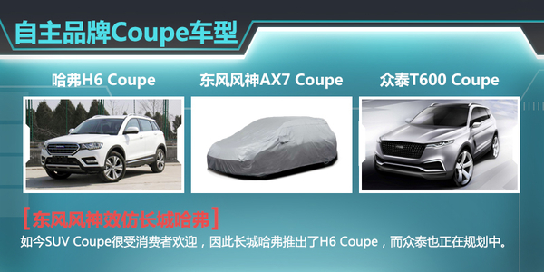 与传统的SUV车型相比,Coupe版拥有更加动感的外观造型,因而对于年轻消费者更有吸引力的。因此,长城顺势打造出哈弗H6 Coupe,并在不久前完成了市场投放。另外,众泰也计划推出T600 Coupe,力图尽早在激烈的市场竞争中占据一席之地。