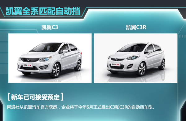 凯翼是奇瑞控股集团下属的全新汽车品牌,产品类型偏向于年轻化。由于旗下并没有配备自动挡的车型,使得产品的市场竞争力不占优势,因此企业规划针对现有的动力系统进行升级。日前,网通社从凯翼汽车官方获悉,企业将于今年6月正式推出C3和C3R的自动挡车型。随后我们又通过走访多家凯翼经销商后了解到,目前这两款新车已经可以接受预定,起售价格大致是在现款各个配置车型的基础上提高1万元左右,因而入门版的价格或为5.58万元。