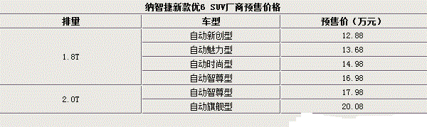 纳智捷新款优6 SUV搭载1.8/2.0 VVT涡轮增压发动机,两款发动机进行调校后,动力表现更加出色。1.8/2.0T涡轮增压发动机的最大输出功率分别为132kW和138kW,峰值扭矩分别为256N.m和275N.m。与现款发动机相比,最大输出功率分别提高16kW和6kW,峰值扭矩分别提高26N.m和19N.m。两款全新发动机兼具轻量、高效率两大优势,让中、低转速均拥有充沛的扭力输出,爆发力十足。传动方面,匹配发动机的是6速自动变速箱。