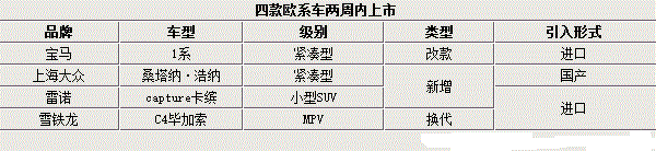 中国汽车市场虽然进入了微增长时代,但各大汽车制造商已久保持着高昂的斗志,其不断将旗下产品导入中国市场,并希望通过丰富产品线争取更高的市场份额。近日,网通社盘点了两周内即将在华上市的四款欧系车型,其中大多数为进口车型,如宝马新1系、雷诺卡缤。而这些车型多数为入门级或者价格较低的进口车,在车市转型买方市场后车企更倾向于针对最能打动消费者的价格因素下功夫。