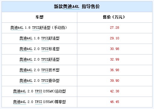 2011年8月30日,2012款奥迪A4L正式上市。此次上市的新款奥迪A4L共有八款车型,相较老款A4L来说,新款车型在增加了一款1.8T入门车型的同时还取消了现款的3.2升顶配车型。2012款奥迪A4L的市场指导价区间为27.28—46.45万元。具体价格信息请看下表。
