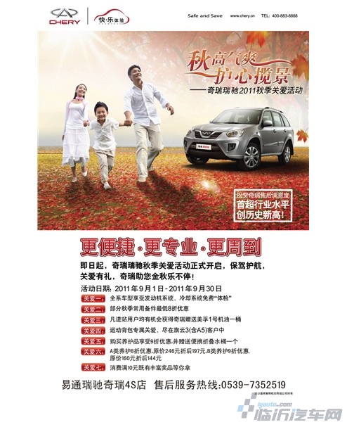 又是一年秋高气爽时,您是否正欲出发遍赏浓浓秋色?9月1日—9月30日,瑞驰奇瑞2011秋季关爱活动如约启动,为您出游保驾护航。