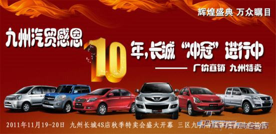 九州汽贸自成立至今已有十年的历程,九州人以“顾客如亲人、质量是生命、改革求发展、奉献在九州”为经营理念,几经风雨在同行业中树立了良好的口碑,今年迎来了九州汽贸十周年的生日,九州汽贸为答谢长期以来新老客户的厚爱,特在本月推出2011年11月19-20日 九州长城4S店秋季特卖会盛大开幕,厂价直销只有 九州特卖才有的优惠,罗庄店、鲁南店、河东店等二十店同步进行,优惠多多惊喜不断,详情咨询临沂九州汽贸4S店