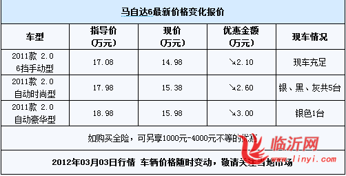 近日,编辑从了临沂骏骐马自达4S店内获悉,该店将于3月8日妇女节当天举办闭店促销活动,活动当天携带女性朋友购车可享受最高三万元优惠,购全险可享受更多优惠,感兴趣的朋友不妨向经销商了解详情。具体车型及报价请参见下表: