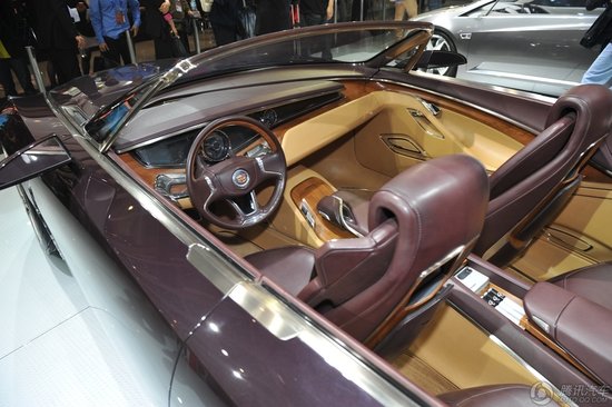 无论从字面上还是实际感受上,Ciel敞篷概念车都反映了美国加州海岸的驾驶体验。赤霞珠般的漆色是专为Ciel调配的,她的灵感来自穿透半透明玻璃杯内红酒的阳光。突出的抛光铝挡风玻璃框架是车辆的重要结构性部件,同样在审美上也是对经典敞篷车的回顾。其他外饰细节,包括盾形格栅、垂直设计的前大灯都保留了凯迪拉克经典元素。但在设计语言的诠释上采用了更具有生态的表达方式,强调艺术和自然。车体两侧更饱满,高亮的部件与深色车身形成鲜明的对比。22寸的铝制镀镍轮毂与整体设计非常一致,清晰可见的碳素陶瓷刹车碟片也为Ciel的性能做下完美的脚注。遵循凯迪拉克的高科技传承,Ciel的车头灯和尾灯都采用了LED照明,包括独特的日间行车灯图案设计。