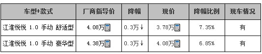 搜狐汽车编辑从江淮汽车某4S店了解到,目前江淮悦悦店内有少量现车销售,现金优惠3000元。颜色有白色、红色等。若预订,订金2000元,提车需等2周左右。对该车感兴趣的网友可到店详询。