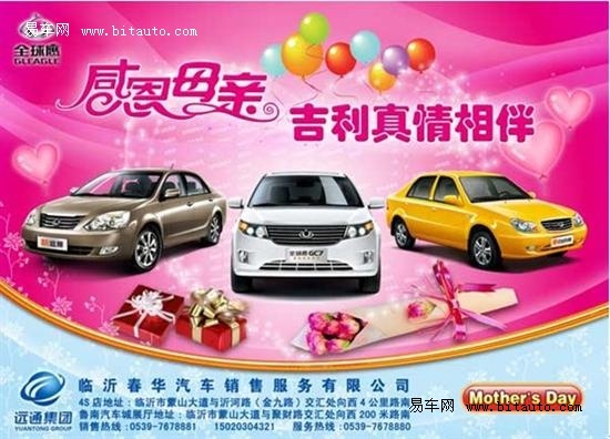 随着母亲节一天天的临近,为了报答母亲对我们的养育之恩,临沂春华吉利4S店在母亲节来临之际开展母亲节感恩回馈活动。凡在5月12-13日进店客户均有礼品相赠,当日购买自由舰,远景,全球鹰GC7全系车型的客户均可获赠母亲节大礼包一份,届时开着您的爱车,带上一束鲜花,回家给母亲做一份美味的饭菜,帮她做个美美的足浴,还等什么?不在此时送上您的一份孝心,要等待何时呢?