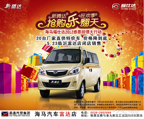 促销狂欢季,抢购乐翻天!活力初夏,海马福仕达汽车感恩回馈大行动,诚邀您参加!超值的特供车,妙趣横生的游戏环节,丰厚无比的惊喜优惠,有得玩,有得拿,让我们一起HIGH翻这个夏天!5.23日海马汽车临沂富达店将进行海马福仕达2012感恩回馈大行动之首届闭店销售活动,敬请关注。