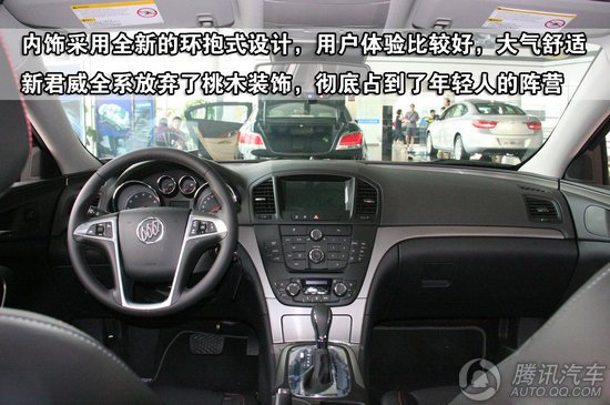 内饰设计方面,君威的内饰整体设计比较时尚,不像德系车那么传统,也不像日系车那么花哨,美系车给人的感觉一向都是比较干练。新君威的内饰整体风格也是别克全新的家族式风格,而且这点在君越以及其他一些别克的系列车型上也都能看出一些共同点来,君威的内饰按键设计的比较密集,给人的感觉稍稍有些臃肿,不过实际使用时的方便程度还是不错的,另外就是君威的内饰用料感觉不如致胜的档次高,给人的感觉塑料感比较强。