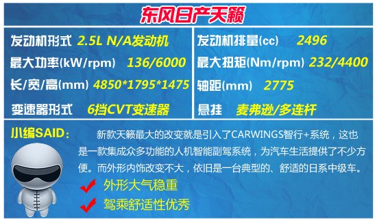 内饰设计方面,改款后的天籁与老款车型的变化就更小了,这一代天籁最大的卖点就是引入了全新的日产“CARWINGS智能行车”系统,该系统可以与其他几款人机互通系统向媲美,而且实际使用效果也是非常不错的。另外除了这套系统外,全系车型的配置也是十分丰富的,真皮座椅、真皮方向盘、泊车辅助、电动天窗等等功能均在这天籁的全系车型上有所体现。