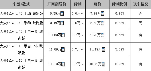 现在购买大众polo手动档车型可享现金优惠6000元,自动档车型优惠7000元,并赠送真皮座椅。现车方面:目前店内仅有少量自动档现车,手动档车型需要预定,定金5000元,约两周后提车。店内有试驾车,可试乘试驾,欢迎感兴趣的朋友到店详询。