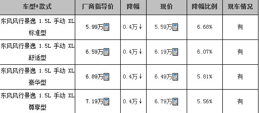 现在购买风行景逸可享4000元现金优惠,并赠送价值1000元新车大礼包,礼包内容自选。现车方面:目前店内现车充足,颜色齐全,店内有试驾车,欢迎感兴趣的朋友到店赏车试驾。