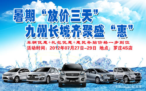 活力盛夏,非常暑假,九州长城给您带来不一样的暑价,7月27-29日,九州长城低价来袭,一车多惠,车辆优惠+礼包优惠+惠民补贴价格一步到位,部分车辆还将赠送价值600元洗衣机一台,清凉暑价,爽购有礼!