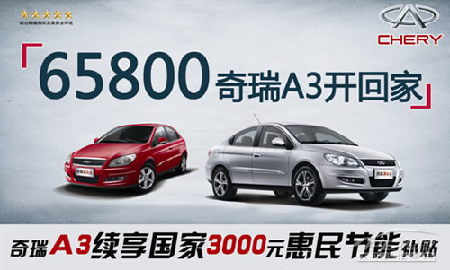金九路奇瑞店又推惠民新举措,为响应奇瑞厂家“A3之道”活动,瑞驰店从厂家一次性买断部分A3特供车,原价75800,现仅要65800您就可以开回家,此次活动为A3上市以来首次,一举将其价格拉进6万元区间,优惠幅度可谓空前绝后,奇瑞A3代表了奇瑞公司“十年磨一剑”的顶尖产品品质,全系标配ESP、四连杆悬架等是真正的五星级安全家轿,且A3是第一批享受国家3000元节能补贴的车型,活动期间购车,还可以参加8月19日晚瑞驰店举行的抽奖活动,现场更有专业技师为您车辆问题答疑解惑,帮助您更好驾驭自己的爱车!详情咨询7352567。