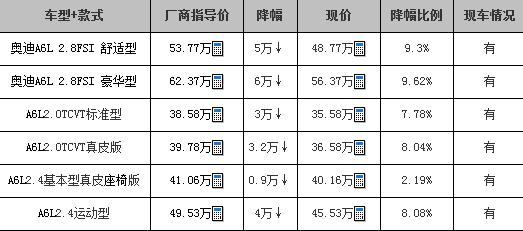 临沂本地奥迪汽车经销商店内有部分2011款奥迪A6L现车,目前购买这款车型,除了A6L2.4基本型仅优惠9000元之外,其余车型均有3万元以上的优惠幅度,其中,2.8L车型最高有6万元的优惠。具体信息如下,感兴趣的朋友不妨与经销商了解详情。