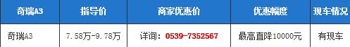 近日,编辑从金九路临沂瑞驰奇瑞4S店了解到,奇瑞A3续享3000元国家节能惠民补贴,指定车型最高直降10000元,感兴趣的朋友不妨致电经销商或到店详询。