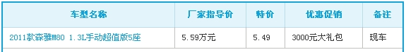 【临沂汽车网】编辑从临沂远通华强一汽佳宝森雅4S店获悉,目前森雅M80现车有售,购M80 1.3L标准版,赠送价值3000元大礼包,对森雅M80感兴趣的朋友可向经销商详询。