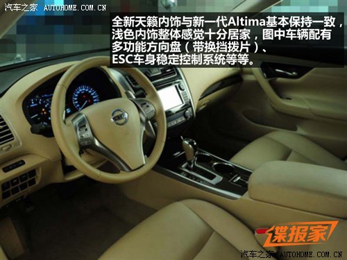 内饰方面,全新天籁与新一代Altima基本保持一致,国产车型有纯黑和浅色内饰供消费者选择。从图中看,此次拍到的车型配置并不低,多功能方向盘(带换挡拨片)、ESC车身稳定控制系统、液晶显示屏幕(带导航功能)、CARWINGS智行++和车载信息服务系统、自动空调等均在该车中出现。