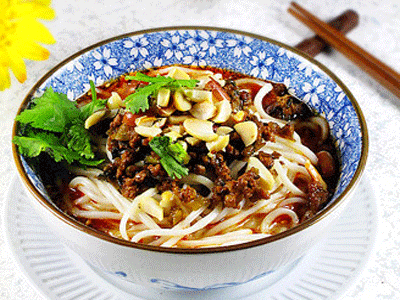 12.将面条捞入汤碗中。浇上肉末臊子,加入花生碎。用香菜点缀一下即可