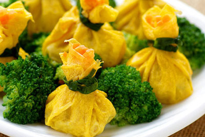 7. 一份蛋皮切4片,取一片包入适量馅料,用烫软的葱叶扎口,排放碟上,隔水蒸10分钟左右,淀粉加水和剩余芝麻油加热调成芡汁,淋在石榴鸡上即可。