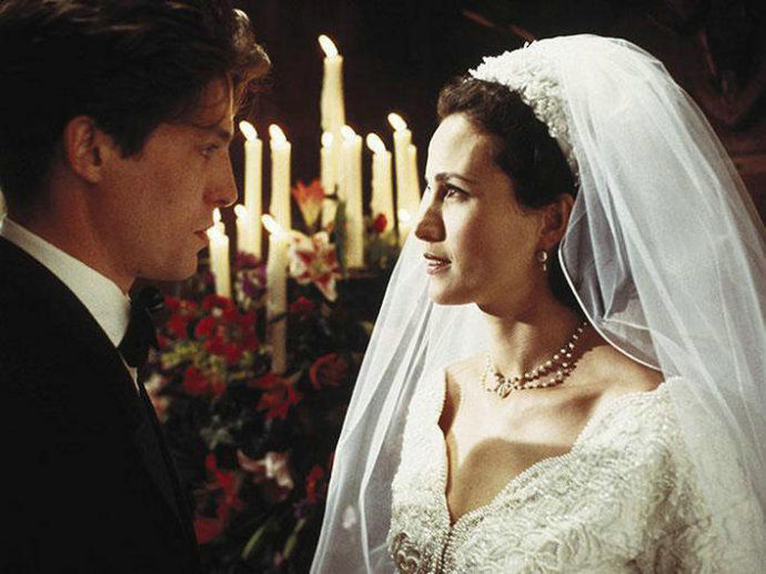 《四个婚礼和一个葬礼(FourWeddings and a Funeral)》的剧情略复杂,不过Carrie(AndieMacDowell饰演)的婚纱还是很简单的,蕾丝装点扇贝型领口倍显优雅,搭配珍珠首饰,显得美丽动人。