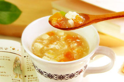 3.汤锅放到火上,加1:1的高汤和清水,大火烧开,放入鸡肉丁,煮沸后倒入豌豆粒,豆腐块,番茄丁,南瓜丁,用中火炖熟炖烂,淋入蛋清,搅打成蛋花,再加盐,白胡椒粉,香油调味,最后用湿淀粉勾芡,撒上香菜碎就做好了,很好喝,减少些调料,宝宝也可以吃。