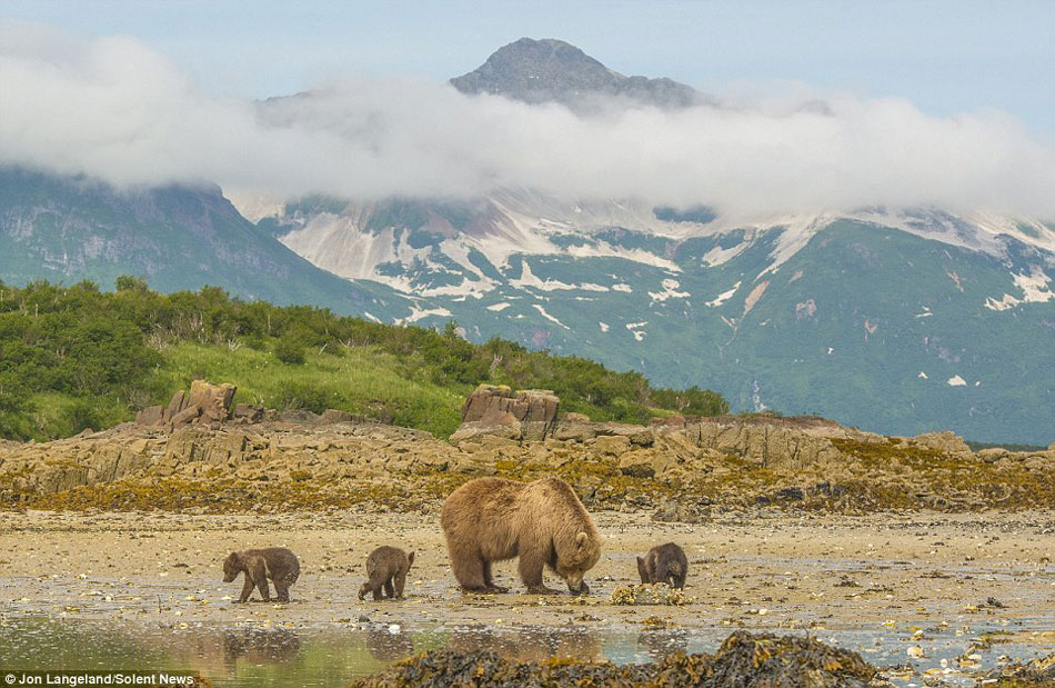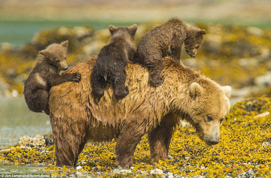 熊妈当船载3只熊崽过河
