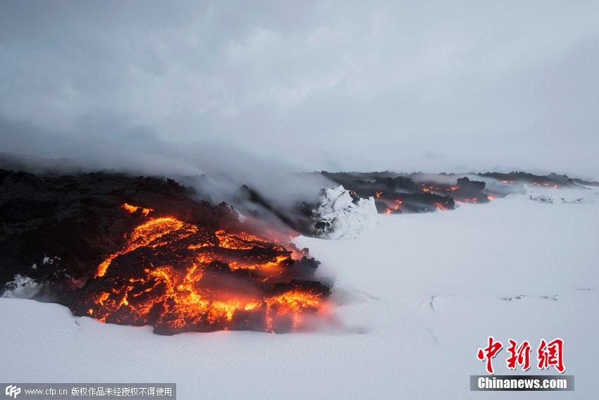 冰岛火山熔浆喷发 出现冰火相融景观