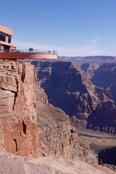 大峡谷天空步道的创建者大卫?金说:“我想让游客体验老鹰高空翱翔时的视角。”这座玻璃桥位于大峡谷悬崖边上,向外伸出70英尺(约21米),从这里向下4000英尺(约1912米)就是大峡谷西部边缘的最低处。